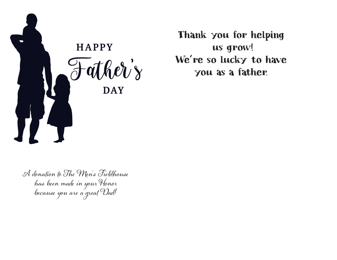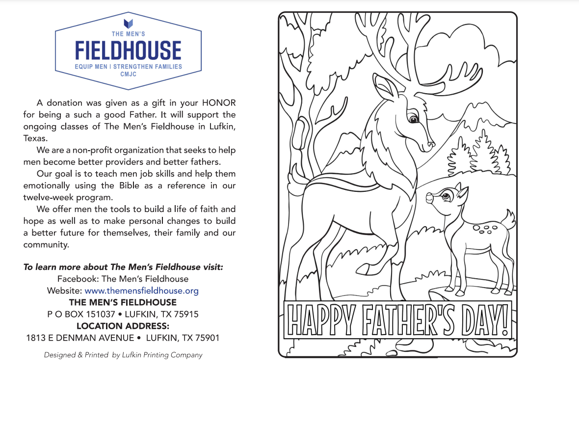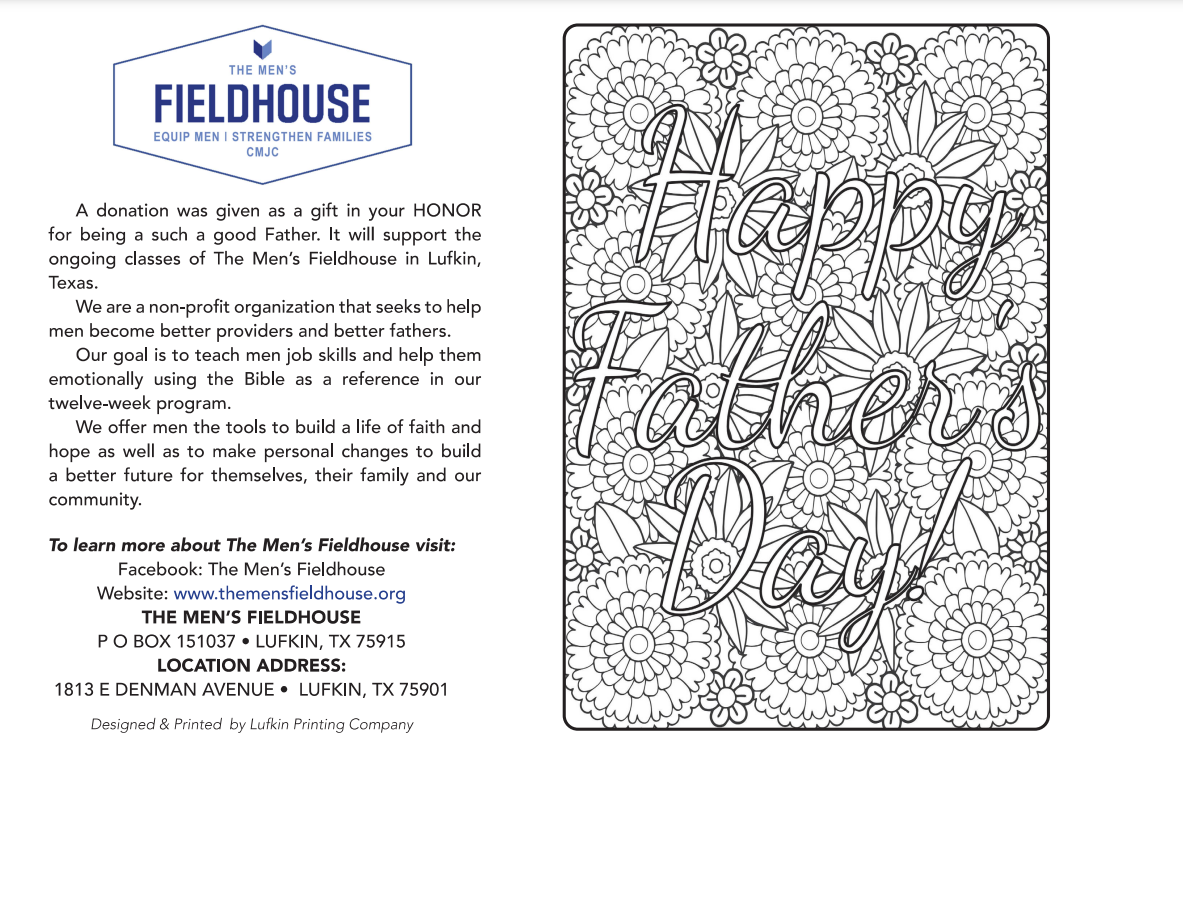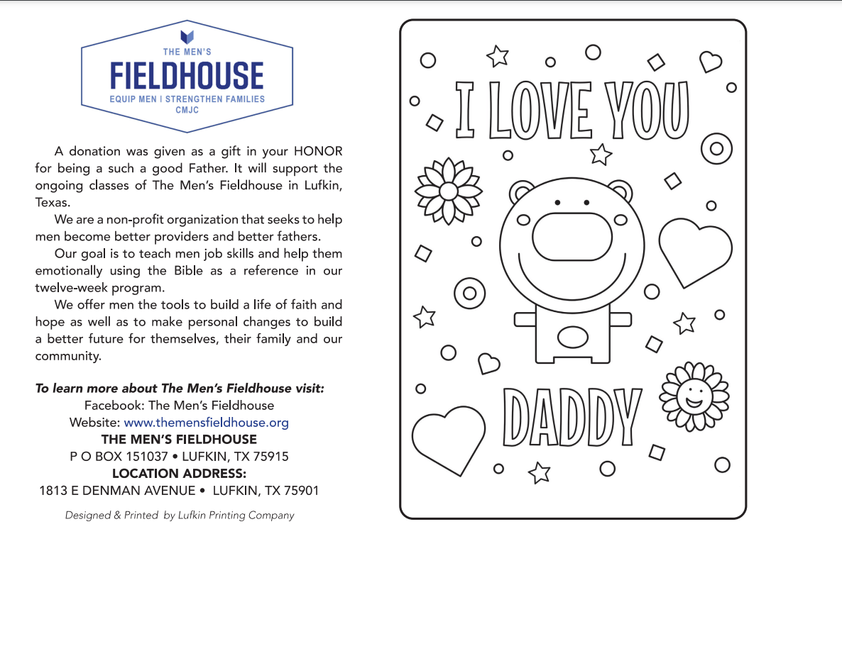 This Father's Day, show your love and appreciation for your dad or father figure with our unique colorable cards. By downloading one of our exclusive designs, you'll make your dad's day extra special. You can also donate to support The Men's Fieldhouse in our mission to break the cycle of poverty for men in our community.