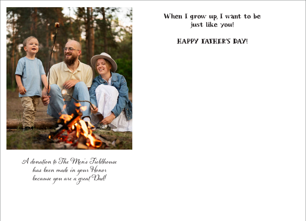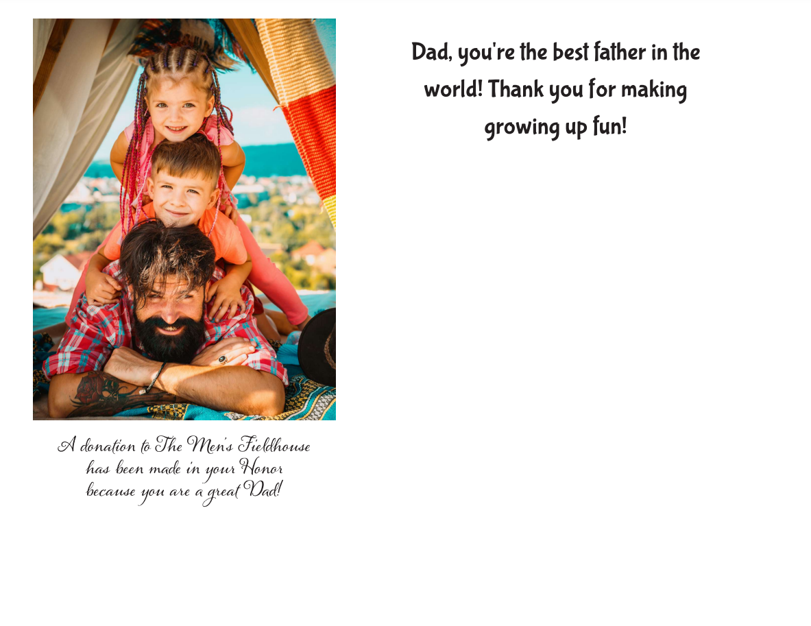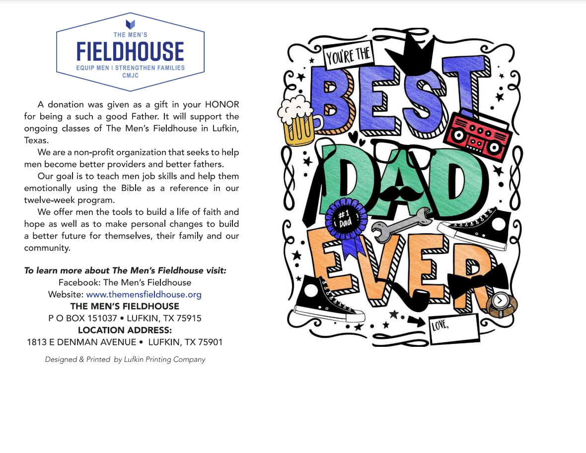 Your donation not only brings happiness to your dad but also supports The Men's Fieldhouse. Our organization is dedicated to helping men break the cycle of poverty by offering education, resources, and support in all aspects of life: emotionally, physically, economically, and spiritually.